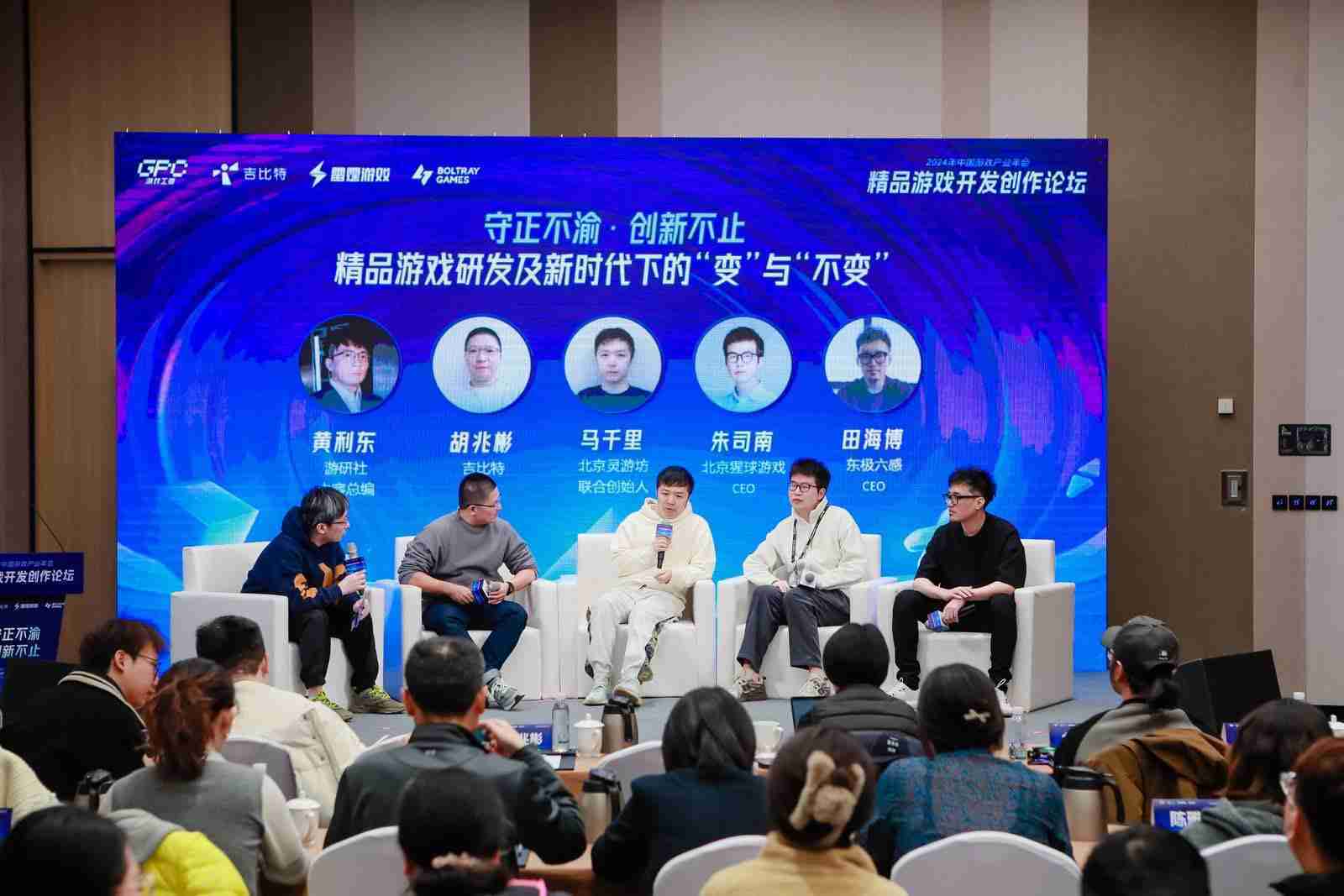 圆桌对话环节,,,,在游研社内容总编黄利东的主持下,,35273CTO胡兆彬、、、、北京灵游坊联合创始人马千里、、、、北京猩球游戏CEO朱司南、、东极六感CEO田海博等四位嘉宾围绕“守正不渝、、创新不止——精品游戏研发及新时代下的‘变’与‘不变’”这一主题分享了各自在精品游戏开发理念及工程能力搭建方面的见解和经历,,并就行业变化下游戏人需要坚守的理念等展开交流探讨。。。